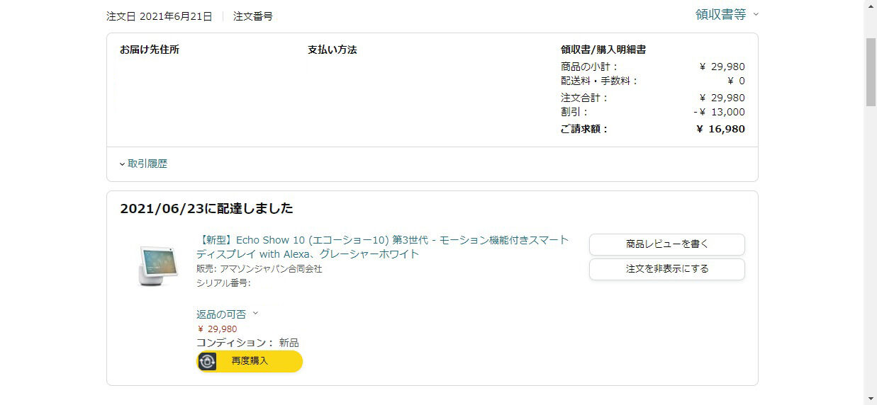 しかし、今回もEcho Show 8の時と同様に、Amazon Prime Dayで16,980円まで価格が下がったタイミングで購入することとなりました。