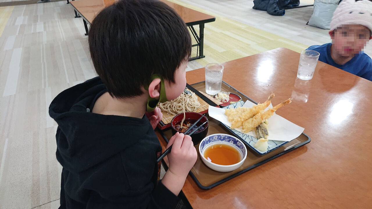 ひとっ風呂浴びた後は、ランチ。日帰り温泉施設ですが、ランチも結構充実していて良かったです。息子①は何故か大好きな蕎麦と天ぷらを平らげ、かなりご満悦の様子です。