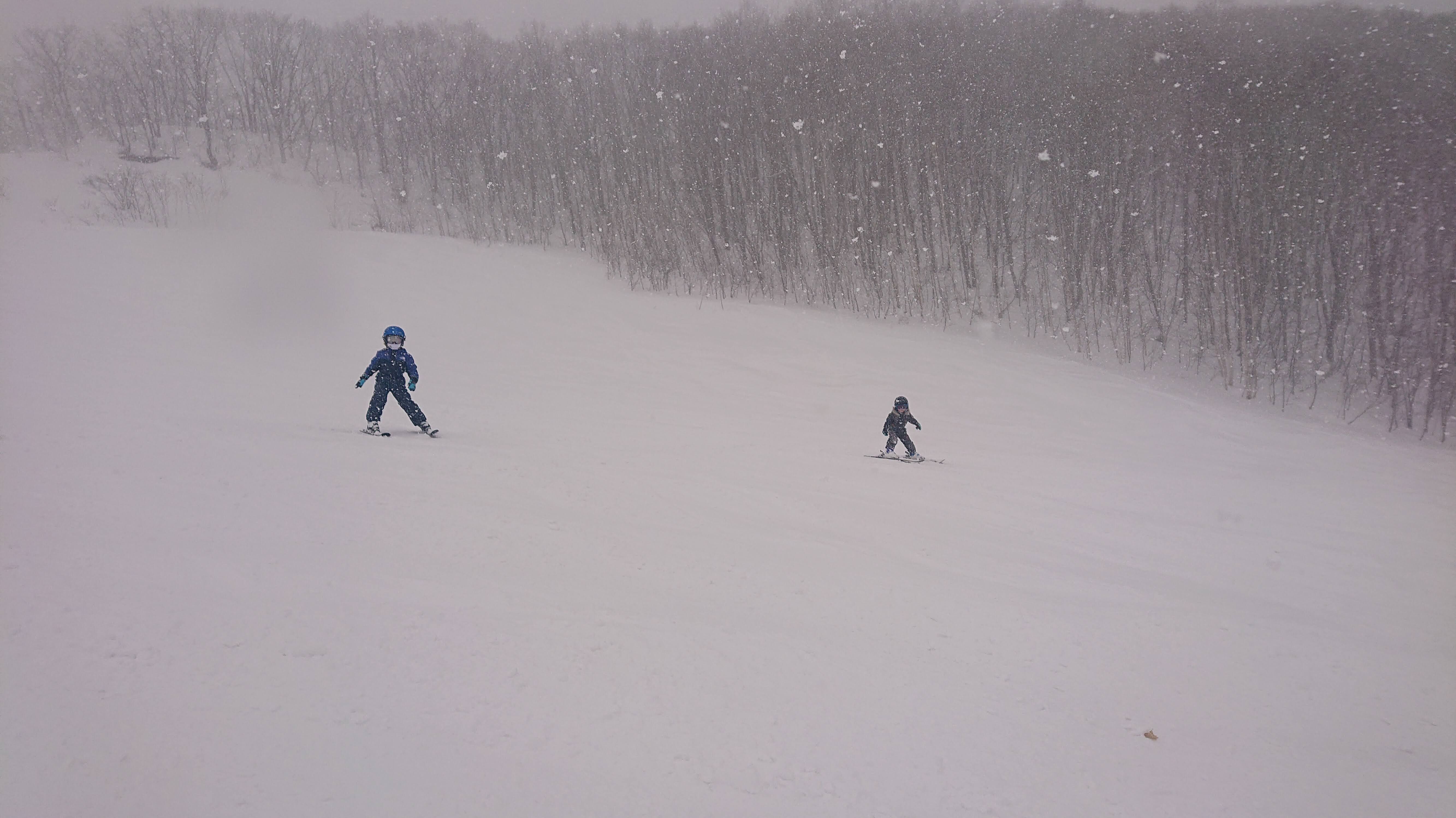 滑り始めるとA君は私が想像していた以上にスキーが上手で、見る見るうちに下っていきます。対して息子①は、初めての場所でかつ吹雪という悪条件の中、「怖い怖い」と恐る恐る下ることしかできません。