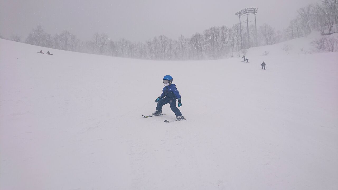 スキー場に到着し、早速イエローリフトで上に上がります。先程まで晴れていたのですが、ここにきて吹雪になってきました。ONZEでリフトはすでに体験している息子①ですが、リフトの乗り降りがかなりスムーズだったので驚きました。滑り始めるとA君は私が想像していた以上にスキーが上手で、見る見るうちに下っていきます。対して息子①は、初めての場所でかつ吹雪という悪条件の中、「怖い怖い」と恐る恐る下ることしかできません。