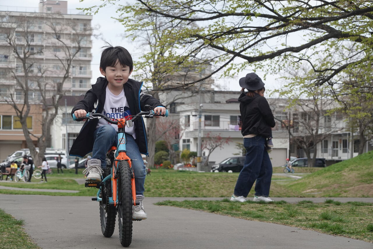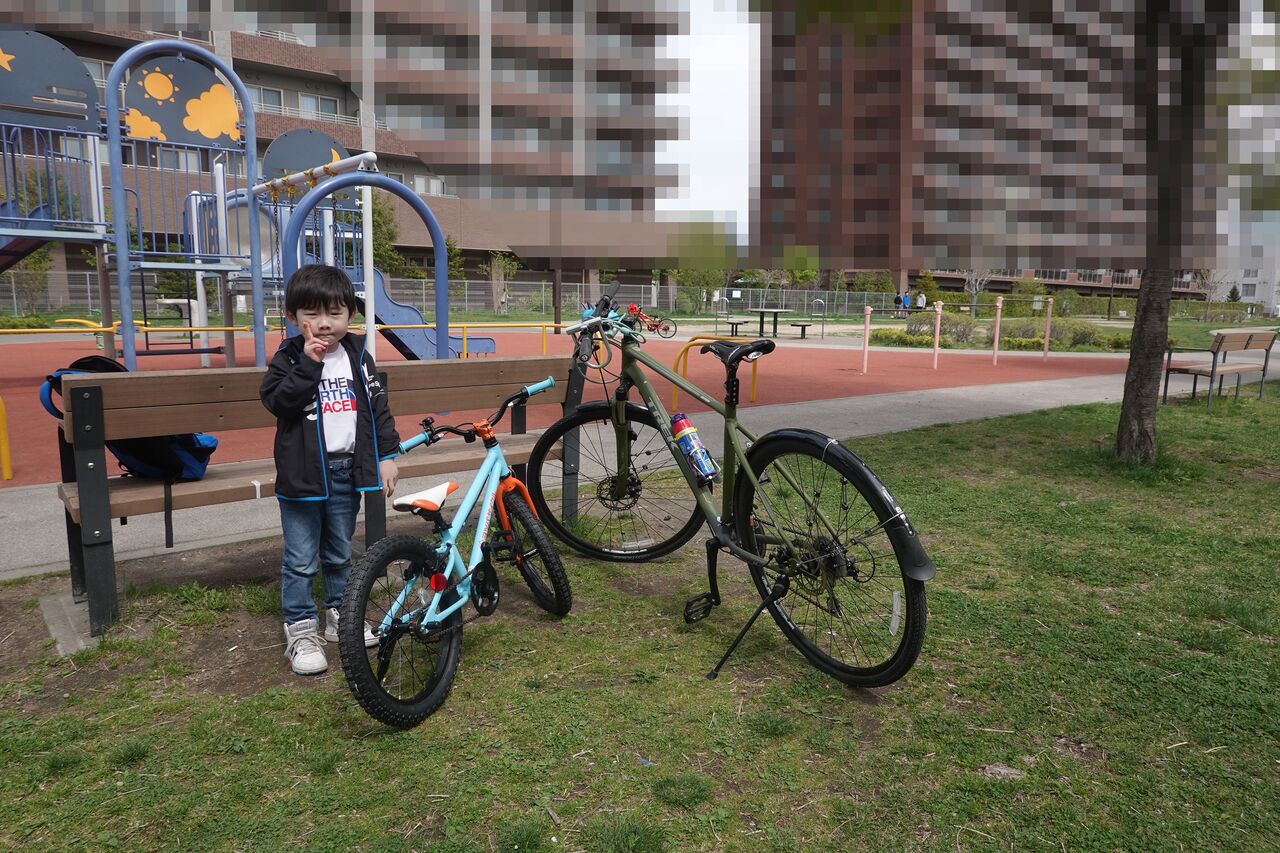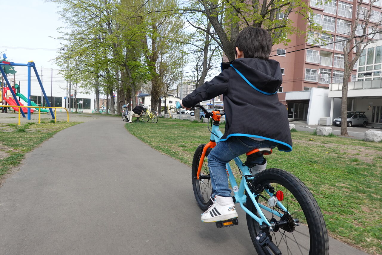 先程のサイクリングやこの公園で、サドルの高さを色々と調整しましたが、息子①曰く地面につま先が着く程度の高さだと漕ぎやすいようでした。14インチの時は足裏がベッタリ着くように調整していましたが、そろそろそれも必要無いかもしれません。