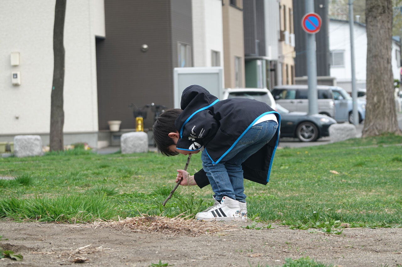 この日の公園は、いつにも増して子どもたちで溢れかえっており、3密状態を避けるために遊具エリアで遊ばせる事はしませんでした。幸い(?)にも、息子①は自分から他の子どもに話しかけて遊びに入れて貰うような積極的なタイプではなく、遊具も恐る恐る触るほど臆病な性格であるため、遊具エリアに立ち入らなくても特に問題は無いようで、木の枝で絵を書いたり、石を掘り出したり、ビーチフラッグみたいな事をやって遊びました。