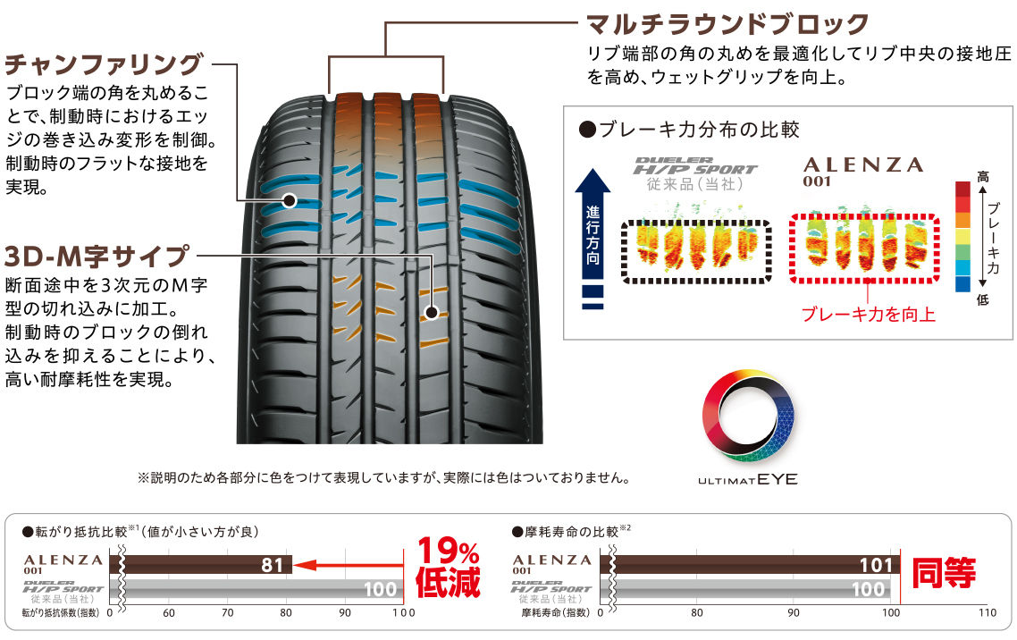 ポイントとしては、従来のSUV用タイヤと比較して高い運動性能を持ち、転がり抵抗の低減及び耐摩擦性能の向上により高い燃費性能を持ち、重量が重いSUVでも安心できるウェット性能を確保したことだそうです。