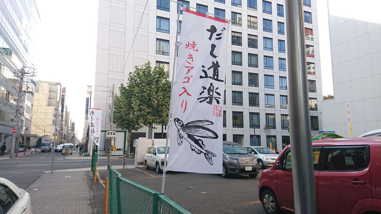 一昨日だったでしょうか。いつものように地下鉄に乗り、いつもの様に大通駅で降り、いつもの出口から地上に出て10歩ほど歩くと、変なノボリが目に入りました。そのノボリには、「だし道楽 焼アゴ入り」と書かれています。