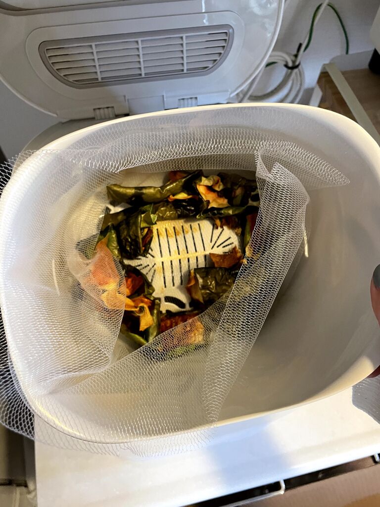 本格稼働時には、付属のバスケットに水切りネットを被せ、三角コーナーとして使用します。生ごみがある程度たまったら水気を切れ、受け皿に乗せ、本体に入れて電源を入れる感じのようです。
