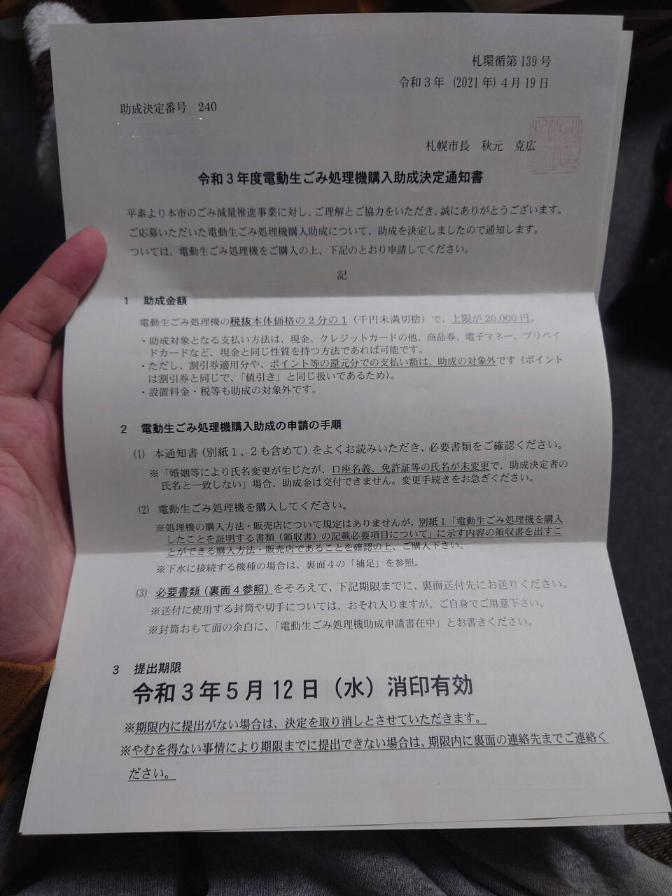 私がパリパリキューブのホームページを見て購入助成を知ったのが4月13日、そして幸運な事に札幌市の令和3年度電動生ごみ処理機の購入助成がその翌日からの受付という事で、このタイミングを逃す手は無いと翌日すぐに申し込みを行いました。