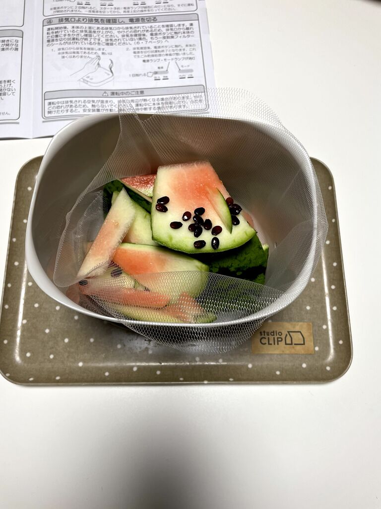 さて、我が家にとってはじめての生ごみ減量乾燥機なので、早速その実力を試してみることにしました。今回は水分含有量が多いスイカの皮で実験する事にし、乾燥にかかる時間も気にしてみました。