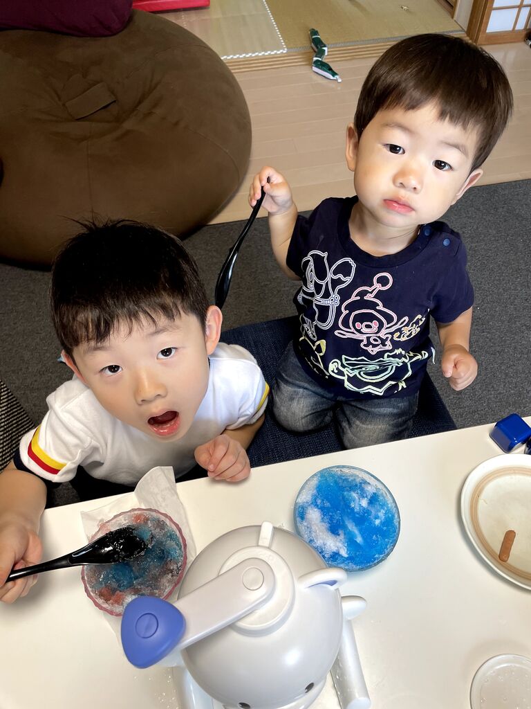 一生懸命ハンドルバーをクルクルしてできたものはただのかき氷ですが、できた時は子ども達から歓声が上がりました。ちなみに、息子①は好きなだけシロップをかけるので、最早かき氷とは言えない物になってしまいますが、まぁ作る工程から楽しめるのは良いことです。