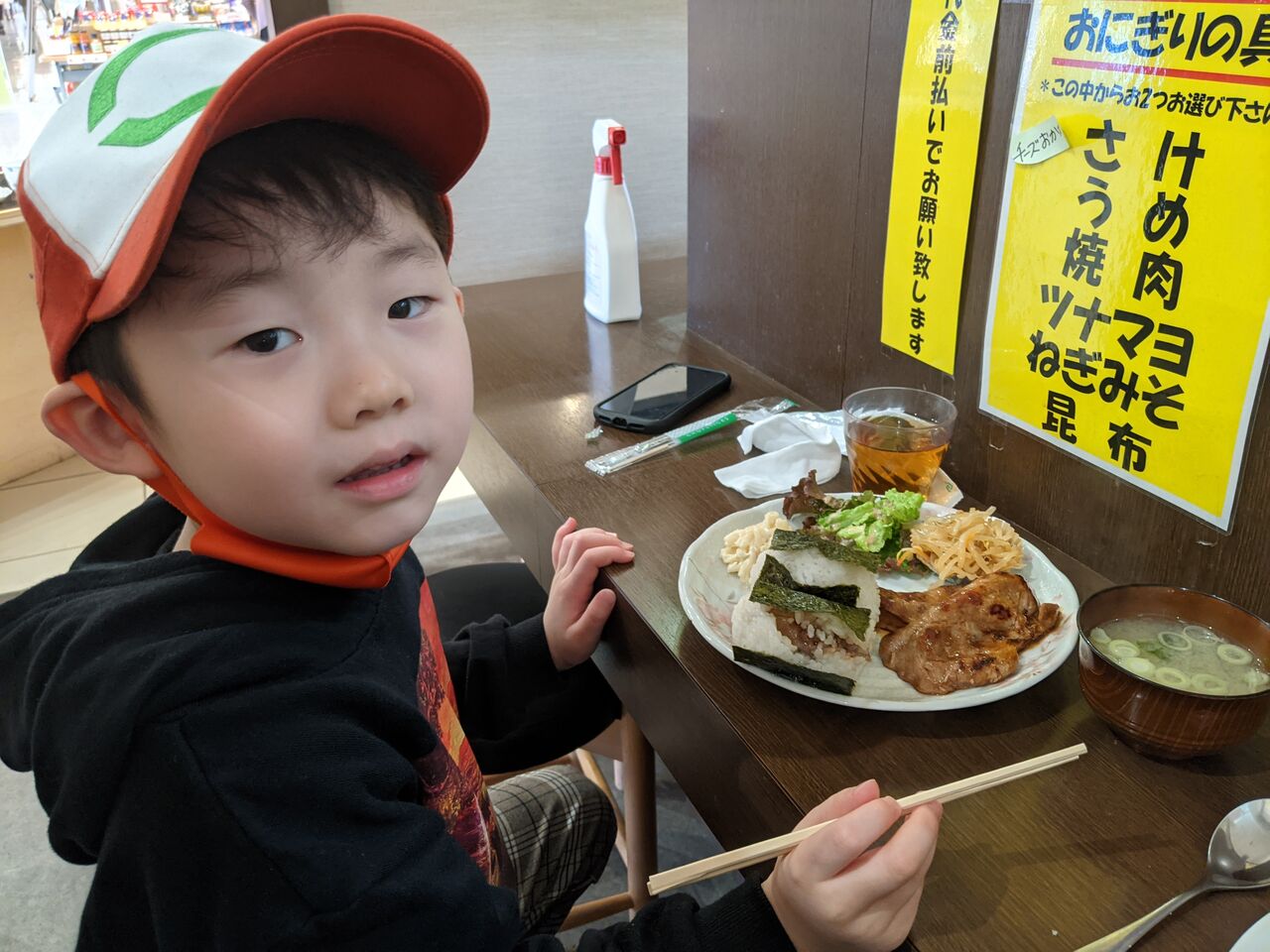 その際、コロナ禍以前はNAS内で飲食が可能だったため、毎回おにぎりや いしもりでおにぎりとお惣菜を購入して食べていました。息子①は、特に五目おにぎりが大好きで美味しいと言いますし、私も生姜焼き弁当など色々なお弁当を食べたことがあります。