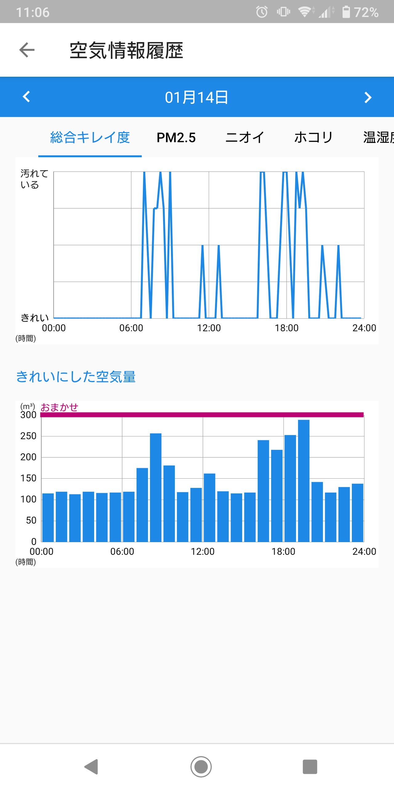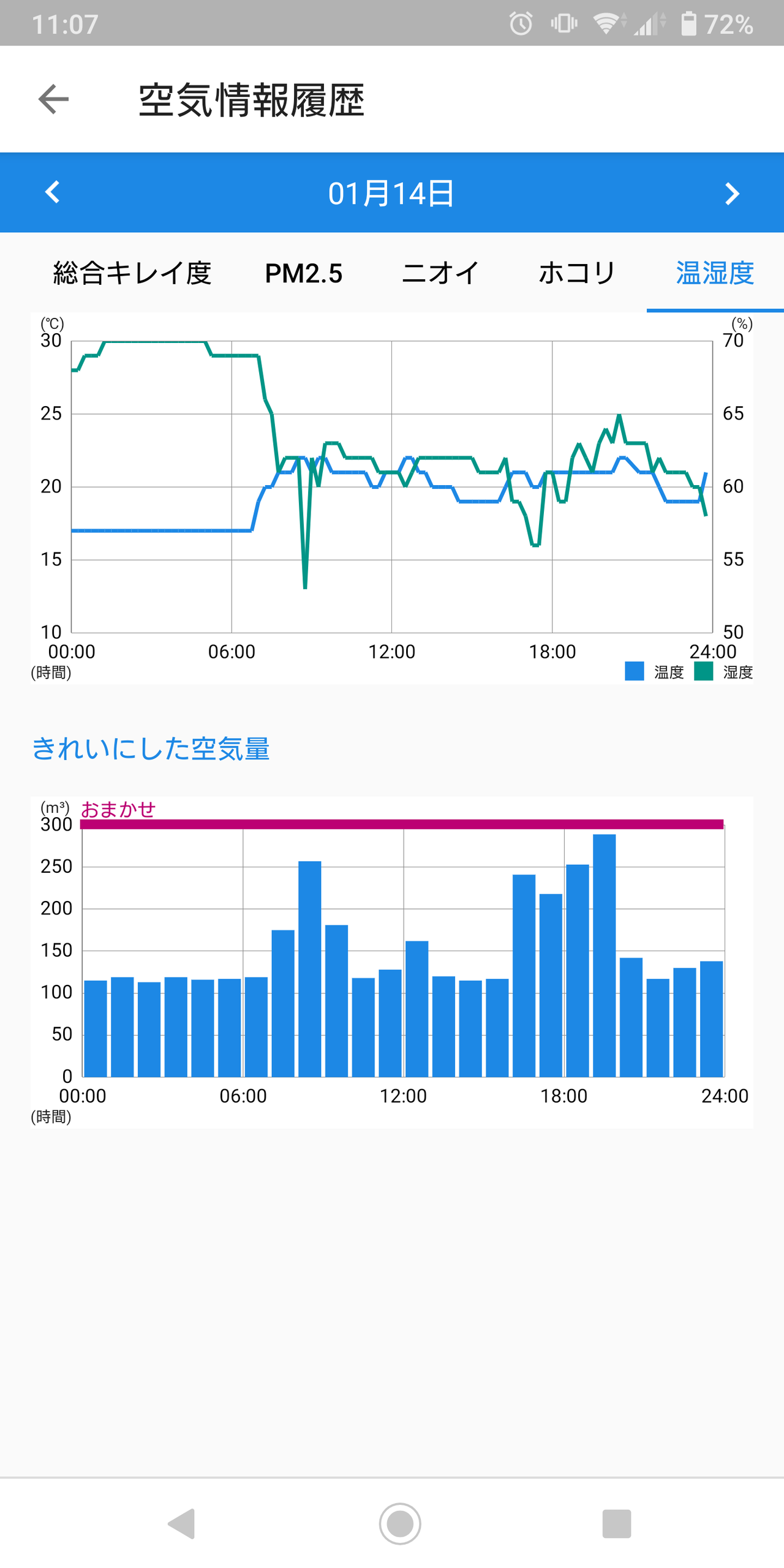 また、室内の空気環境のログも残っており、どういった状況で、何が反応して、どんな運転をしたかなどを確認できるのは、それ自体にそれほど大きな意味は無いのかもしれませんが、個人的にはひじ用に興味深く楽しいと思います。