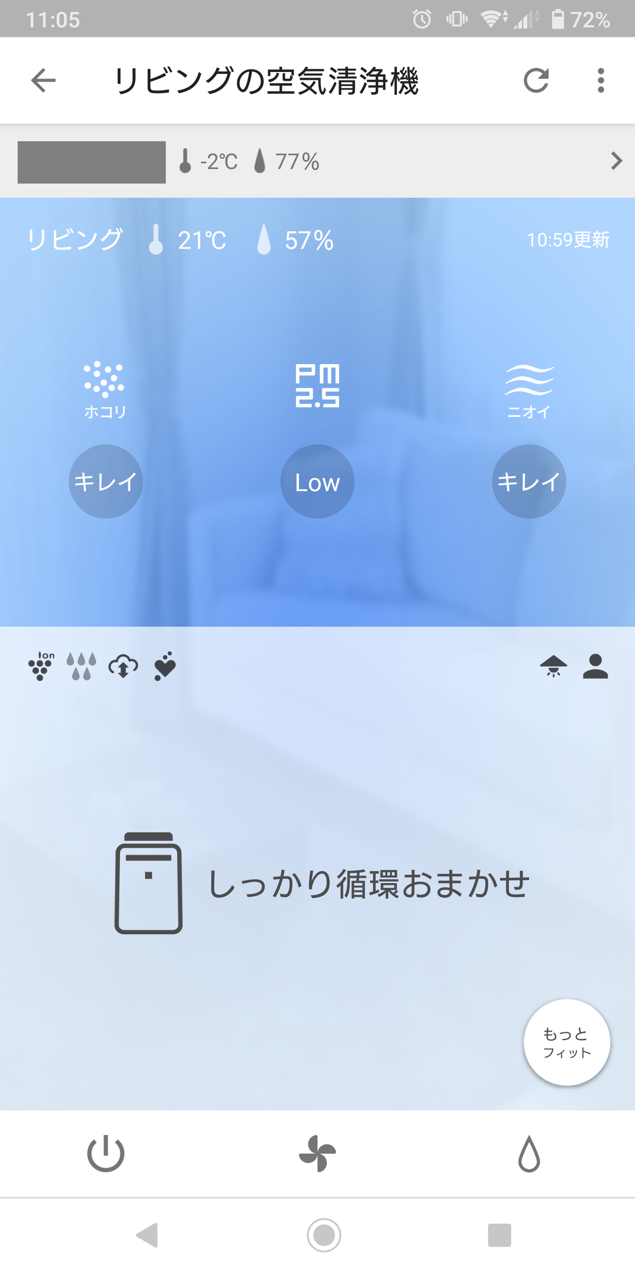 いわゆる全自動モードで、最も使用する時間が長いモードだと思います。自動で風量や加湿量を切り換えてくれるので、常に最適な状態の運転が可能です。また、このモードでは、COCORO AIRアプリでクラウドサービス(おうちフィットなど)機能をONにすると、生活パターンに応じて最適な運転をしてくれます。