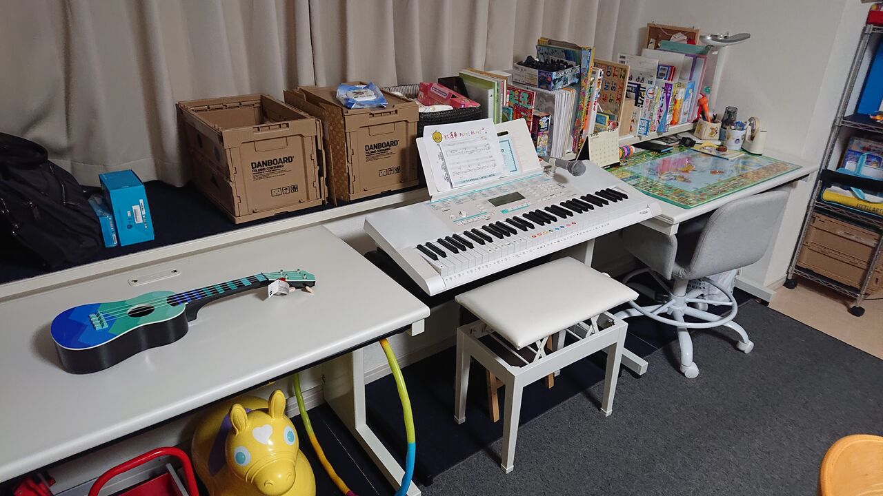 最初のうちは学習机の上に玩具ばかり乗っている事も多かったのですが、最近では割ときちんとお片付けができるようになりつつあります。