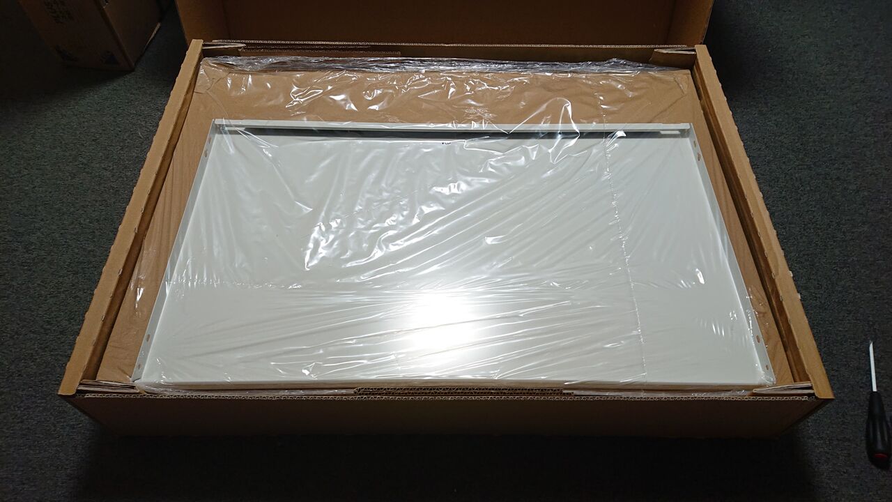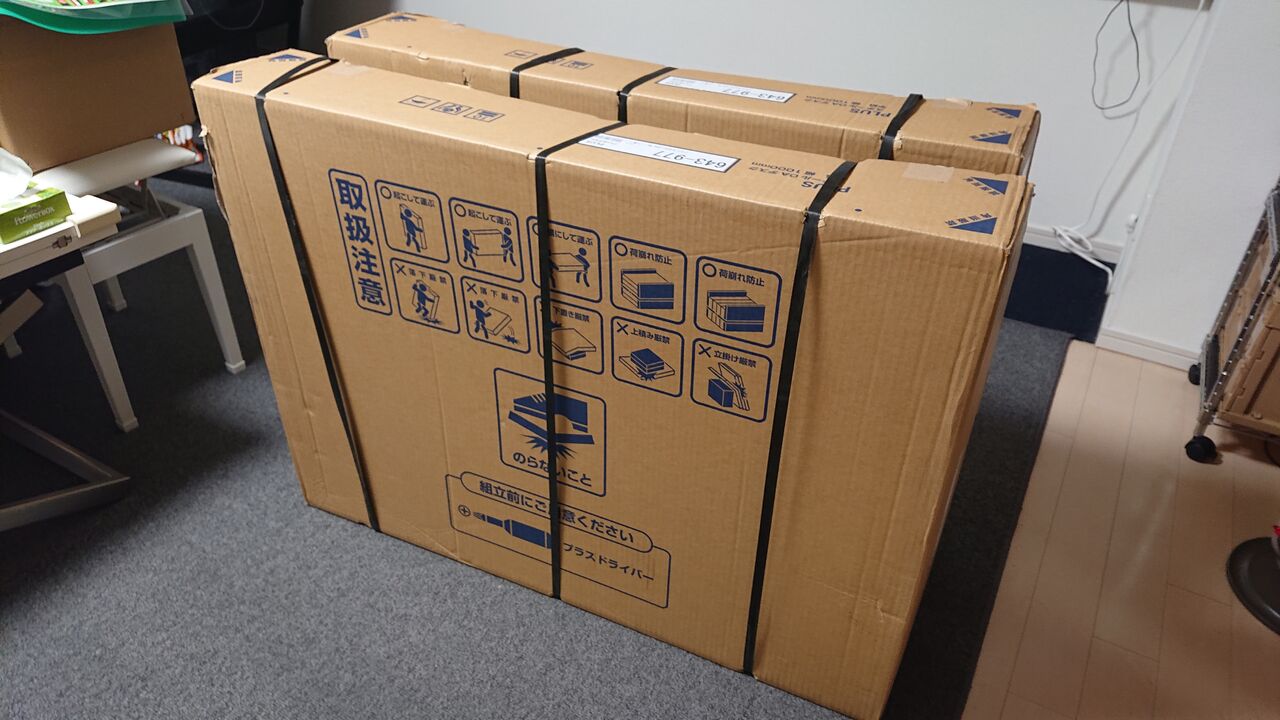 業務用机というのは、長年に渡り毎日使用する事を前提として作られています。また、作業環境にも充分配慮されている製品が多く、それはそのまま子ども向けとしても重要な部分となります。早速、組み立てます。梱包重量で28.5kgとそれなりの重量物なので、女性だと1人で作業するのは難しいかもしれません。