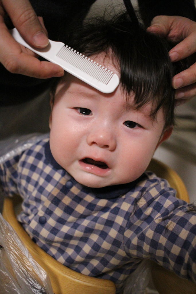 ところが、嫁がハサミをチョキンとした瞬間、息子は号泣し始めました。足をバタバタしたり、身体を動かしたり、手を伸ばしたりしてくるので、とてもじゃないですが散髪どころではありません。
