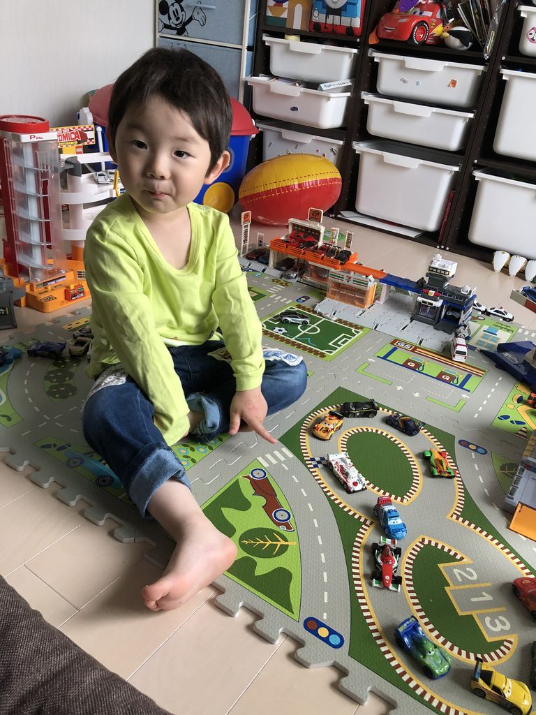 最近ではプラレールより断然トミカで遊ぶことが多いので、ニトリで購入したパズルマットが常設されています。タカラトミーで発売しているトミカ用の道路より安価で崩れる事がないのでとても重宝する一品です。