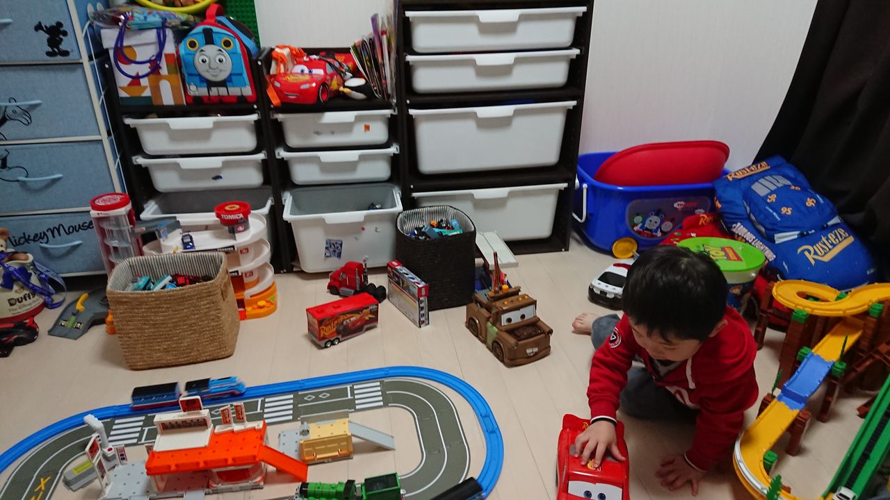 この部屋は大きさが6畳程度と小さいので、プラレールとトミカを共存させるのが難しいのですが、息子は自分で考えてお片付けしたり遊びたい玩具を引っ張り出してきます。
