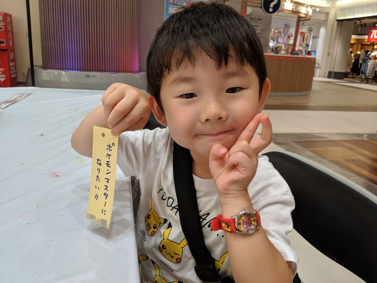 着替えてすぐに車に乗り、ポケモンGOで道中のジムを撃破しつつ、辿り着いたのはアリオ札幌。ここはトイザらスや赤ちゃん本舗があるため、息子が誕生して以降はお馴染みのショッピングモールとなっており、息子も勝手知ったる場所なので伸び伸びと過ごす事ができます。ちょうど七夕前(北海道の七夕は基本8月7日)だったので、御札にお願い事を書くイベンドが開催されており、息子にお願い事を聞くと「ポケモンマスターになりたい」と言ったので、そのまま書いてあげました。ご満悦のようです。