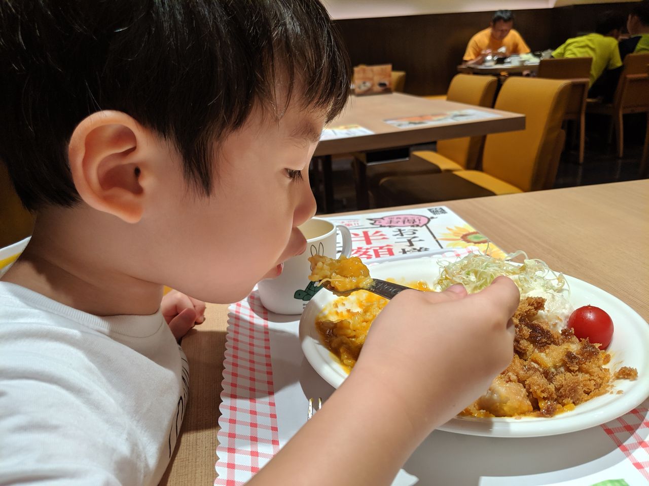 4歳手前の息子は、食事の際に大人が手伝う必要も無くなりましたし、最近はたいていの外食チェーンのお子様メニューは全て食べてくれるので、嫁さんがいなくてもなんとかなりました。