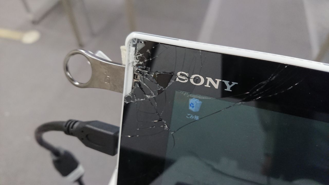 このように激闘を繰り広げた相手であるSONY VAIO Tap11ですが、先日事故によりこのような状態となってしまいました。とあるプレゼンの練習をしていた所、誰も近くにいないのにTap11は1人でテーブルからダイブし、USBメモリ側から着地した為にメモリに押されてしまったようです。