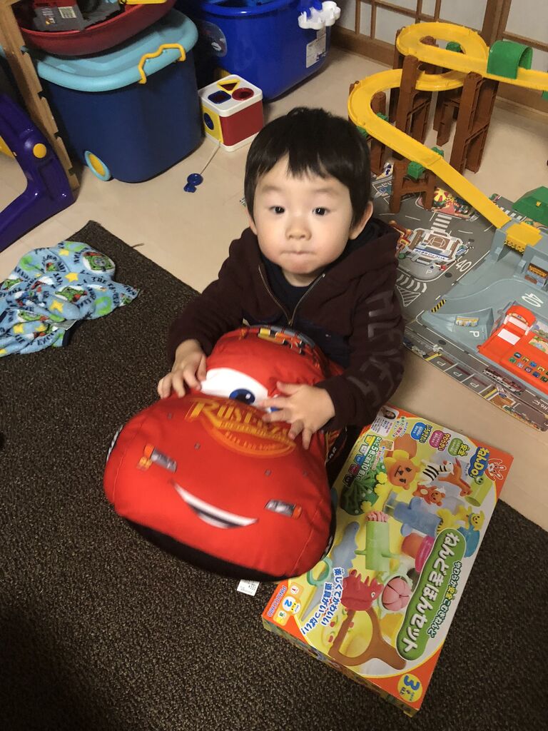 また、カーズ自体への興味も強く、嫁さんとよく映画を見て楽しんでいます。そのため、先日たまたまゲームセンターに寄った時にマックイーンの景品があった時は、どうしても欲しいと粘ったのて仕方なくゲット(確か300円程度で取れました)してあげました。