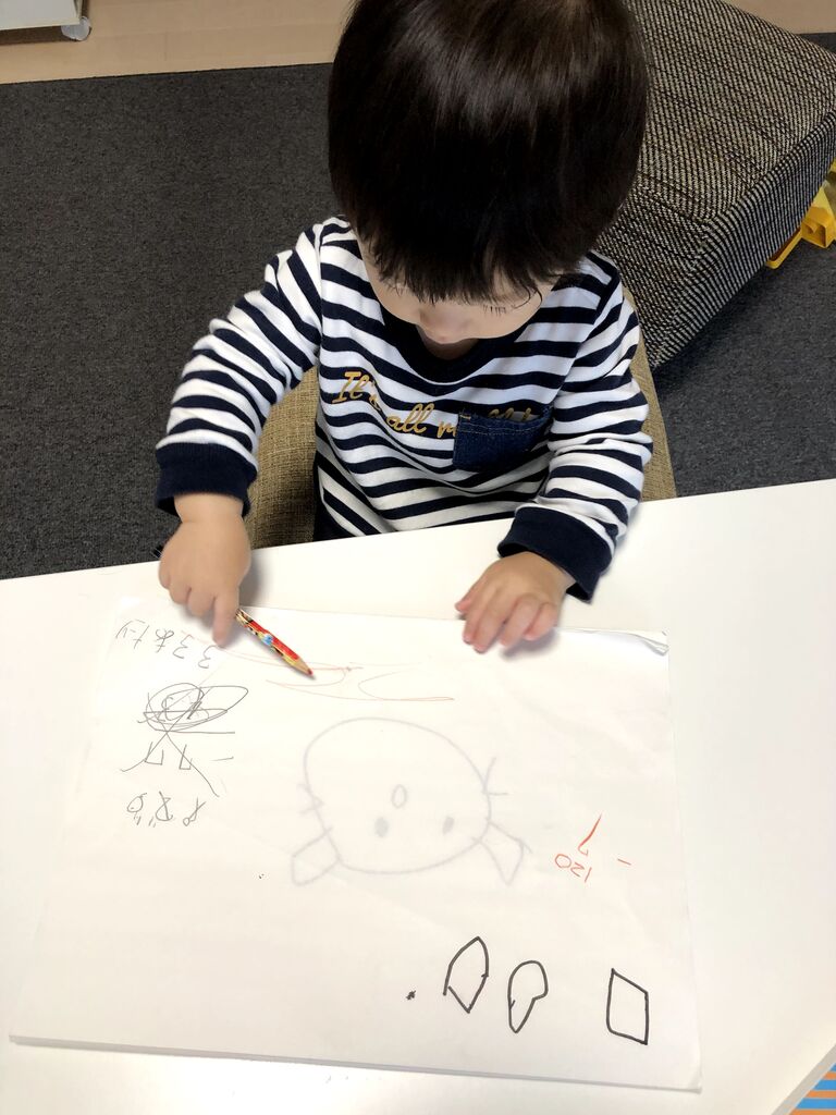 息子①の時は、大きな紙を前にペンを持たせ、勢い余ってテーブルにはみ出した後始末をする作業を約5ヶ月も続けましたが、もちろんそこは玩具資産の1つである「せんせい」に再登板を願いました。