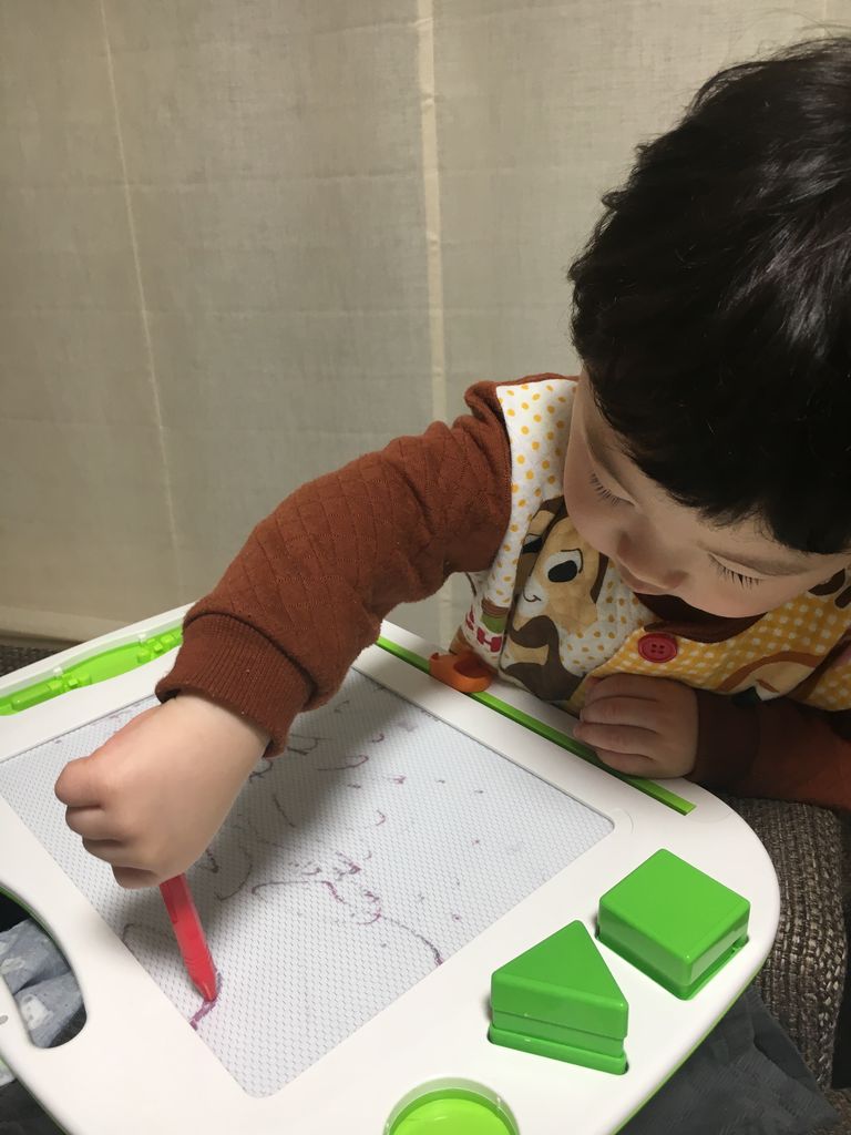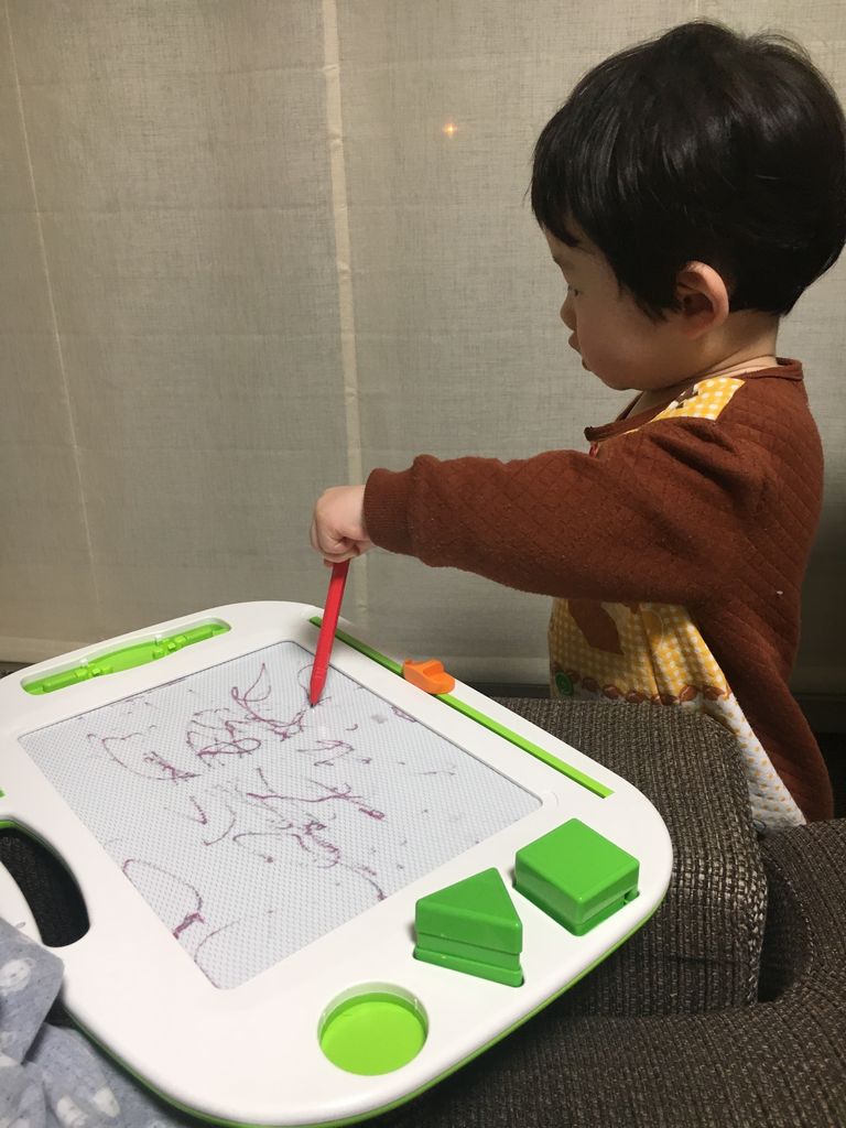 とりあえず一通りの事はできるので一人でも遊べますが、いちいち派手なリアクションをする私か嫁さんと一緒にお絵かきをする方が楽しいみたいです。時にはアンパンマンを書けと要求してくるので、ヘタなりに描いてあげるとキャッキャ喜ぶのでこちらも嬉しくなりますね。使い方は理解している様子