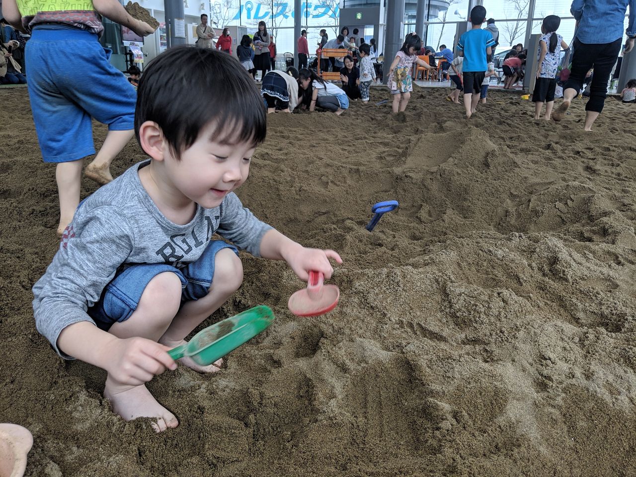 それでも眼前にこれだけ広大な砂場があれば、当然の如く砂まみれになって遊びます。雨模様だったこともあってかなり混雑しており、子どもたちの楽しそうな声が響いており、かなり明るく楽しい雰囲気だったのも良かったと感じました。