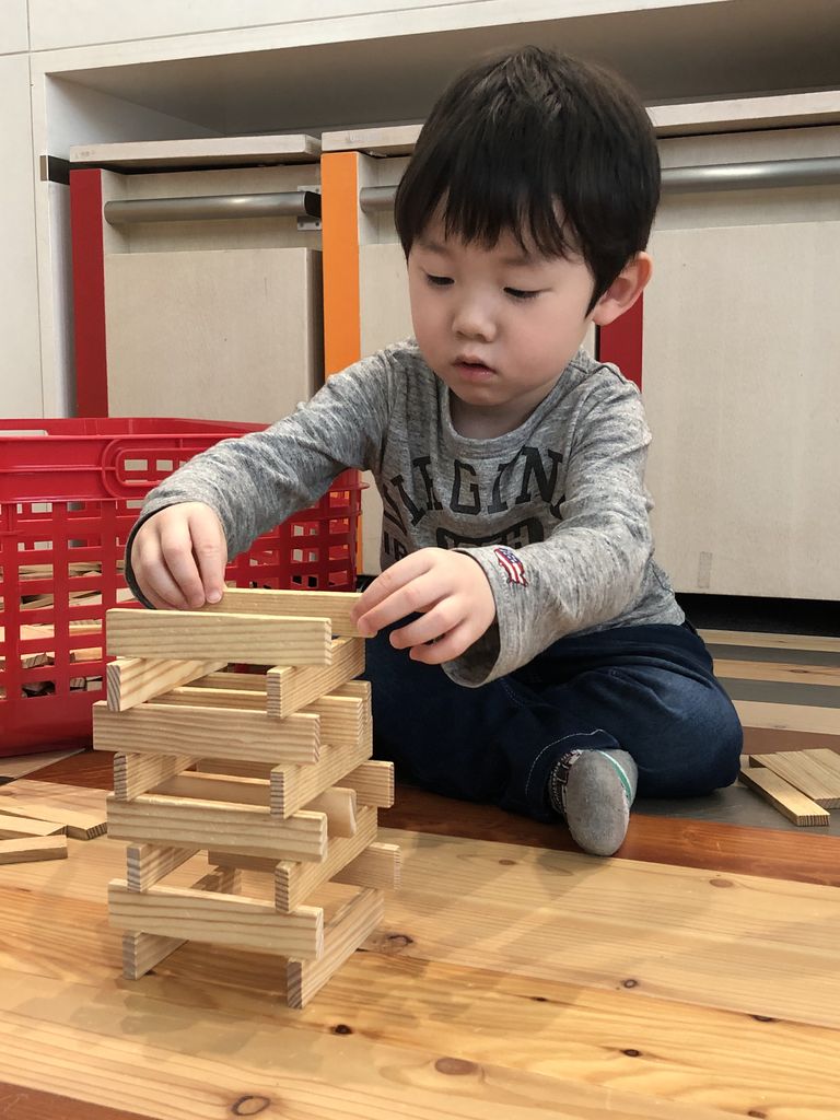 意外にも有料エリア内は無料エリアより混雑しており、1階の木の玩具や3階の科学館エリアは数多くの子どもたちで賑わっていました。息子に科学館はまだまだ早いと思っていましたが、行ってみると様々な展示物に興味を抱いていたのが印象的でした。