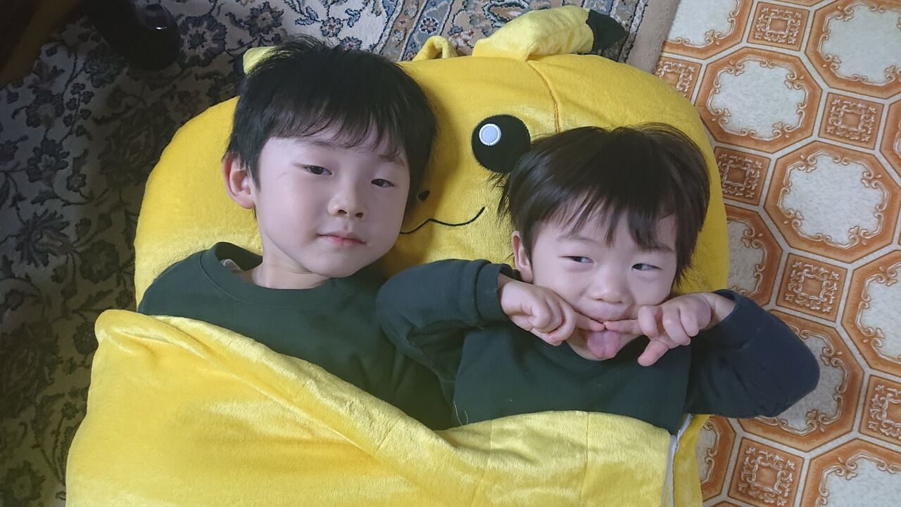 嫁さんの実家に帰宅し、すぐに寝袋に寝る息子達。静電気が物凄いのでエレガードを振りかけた後は、しばらくの間寝袋から出たり入ったりを繰り返して遊んでいました。