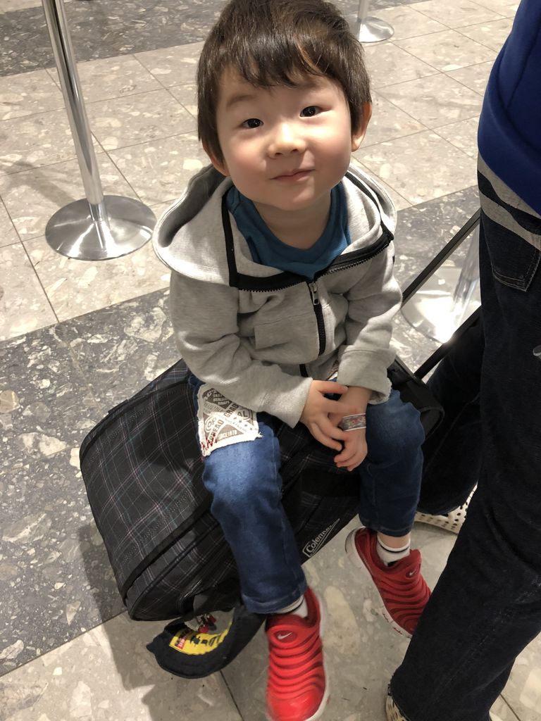 本来であれば仕事と幼稚園がある金曜日ですが、潔く休んで新千歳空港10:35発ANA1712便で関西国際空港へ向かいます。飛行機が大好きな息子は、自ら荷物を持って意気揚々と新千歳空港のカウンターへと向かいます(カウンターに到着したら休憩時間?)。息子はまだ2歳と無料でANAを利用できる年齢であるため、2歳でも有料であるLCCと比較しても費用的にはほぼイーブンです。
