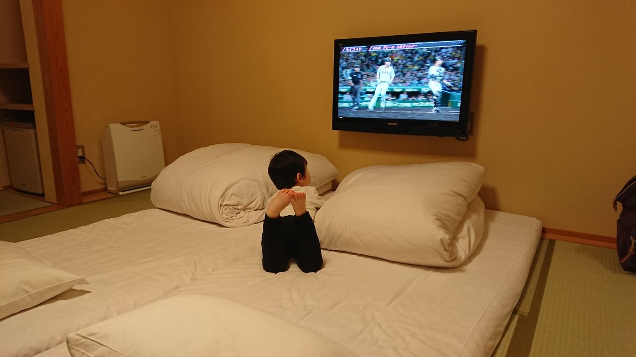 息子は和室にあまり慣れていないのでやや不安でしたが、私と2人で温泉に入り、嫁が風呂に入っている間はプロ野球の阪神戦を鑑賞するなど、とてもリラックスしているようでした。
