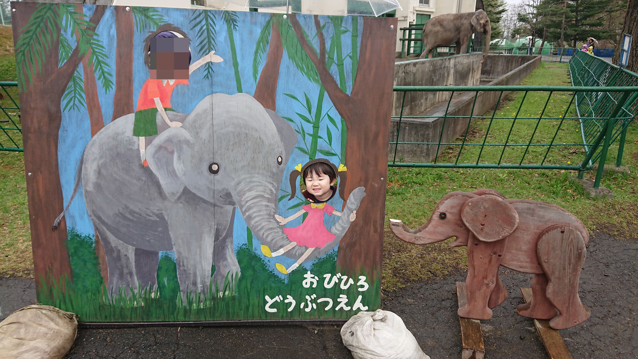 鳥類ゾーンを抜けると早くもメインのゾウとご対面です。お手製の顔出し看板が設置されており、ゾウの子ども人気の高さが伺えます。