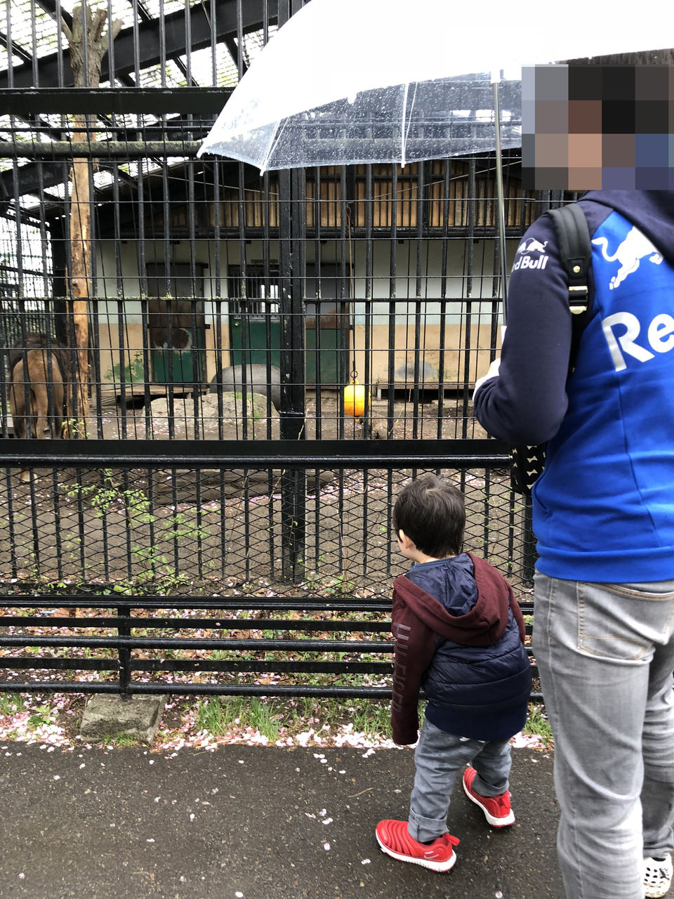 子どもの歩く速度なので結構な時間をかけて円の反対側に辿り着き、カッコいいライオンさんなどを見て回ります。雨はまだ結構降ってますが、息子は頑なに自分の足で移動したがるのでそろそろ全員濡れてしまっています。