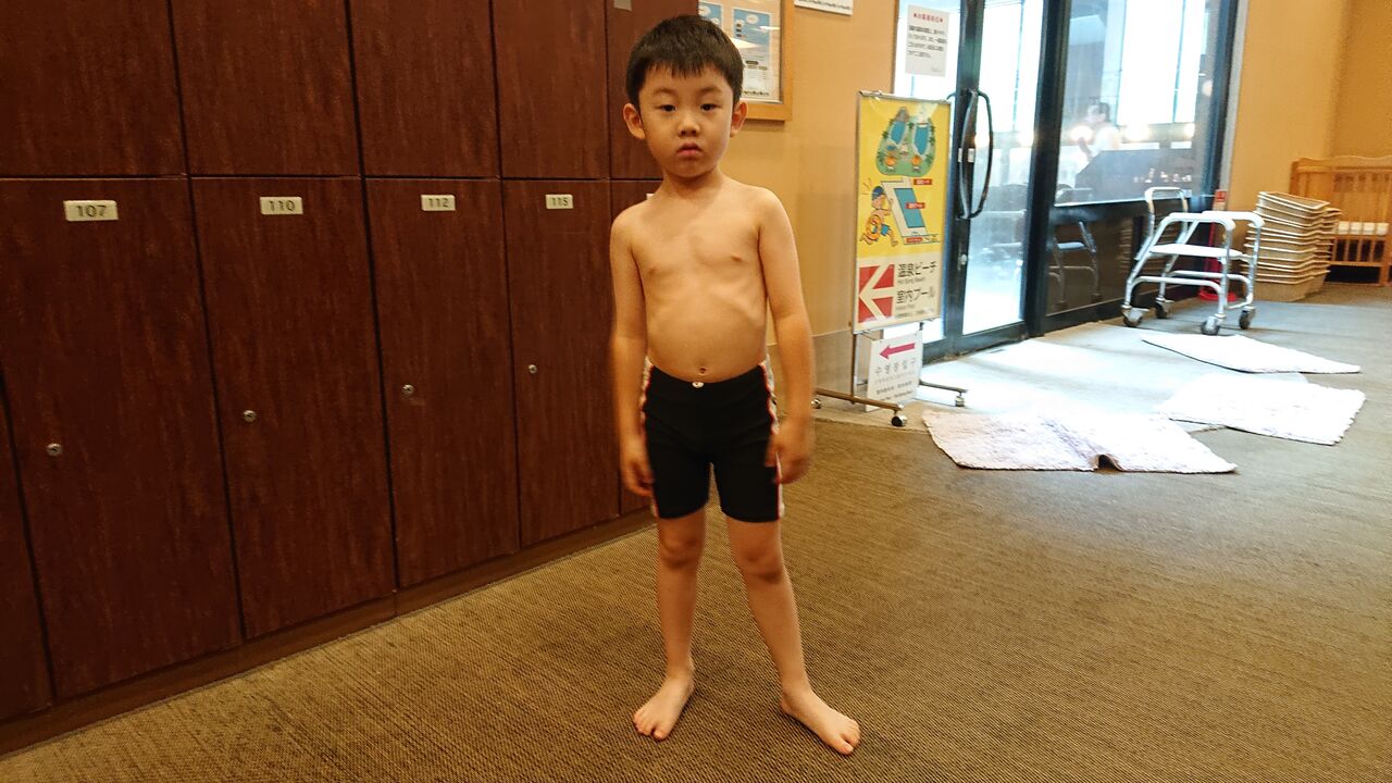 謎解きが一段落し、チェックイン手続きも終わったので息子①が楽しみにしていたプールの時間です。前回同様、プールでの写真撮影は自重したため、更衣室での写真くらいしかありません。15時から17時くらいまでプールで遊びましたが、屋外プールが思ったより寒かった事と、それに伴って屋内プールが大混雑していたため、前回ほど自由に遊ぶ事はできませんでした。