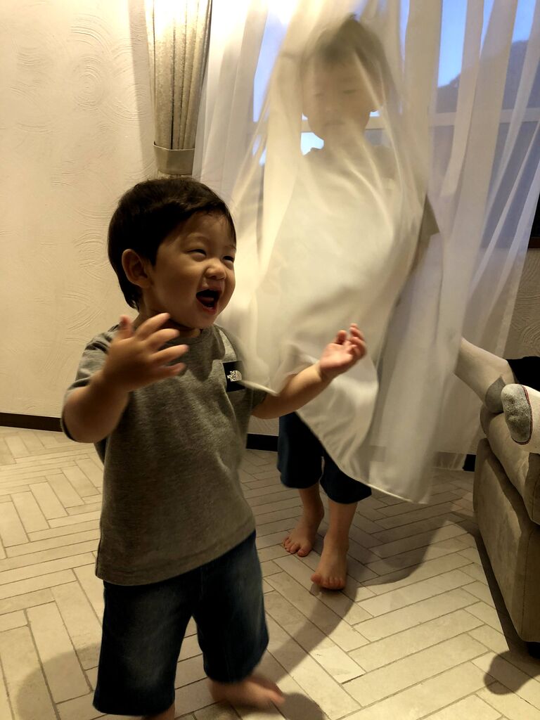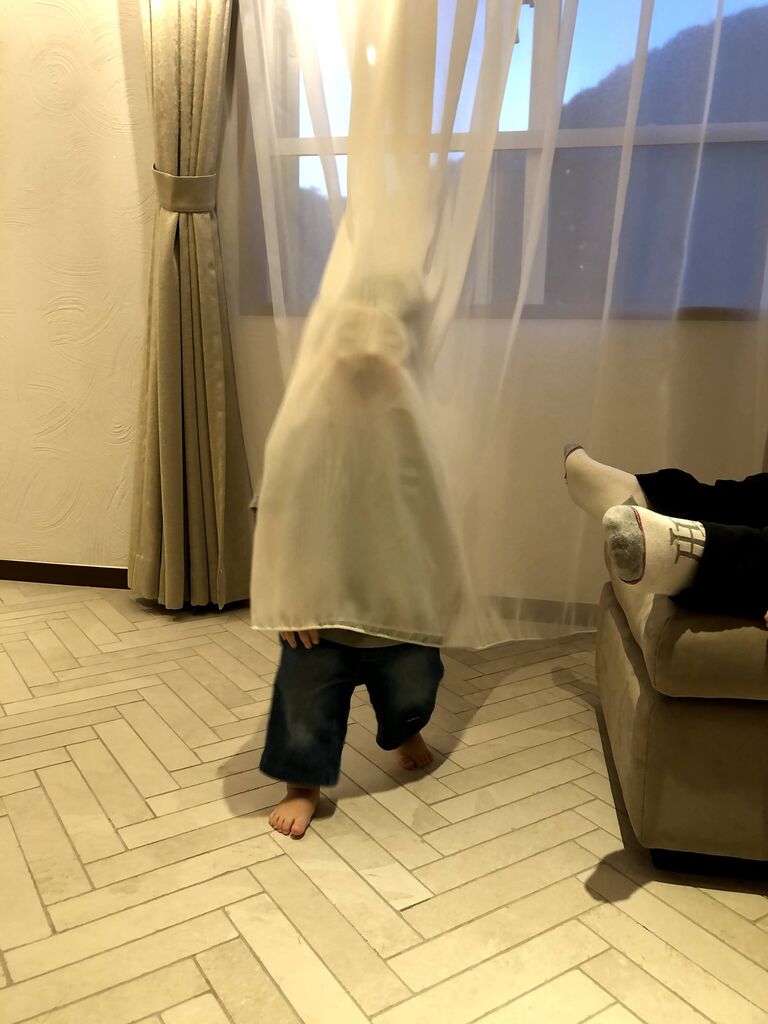息子②はこの部屋のカーテンをとても気に入ったようで、レースカーテンなのにも関わらず、エンドレスいないいないバァをやっていました。