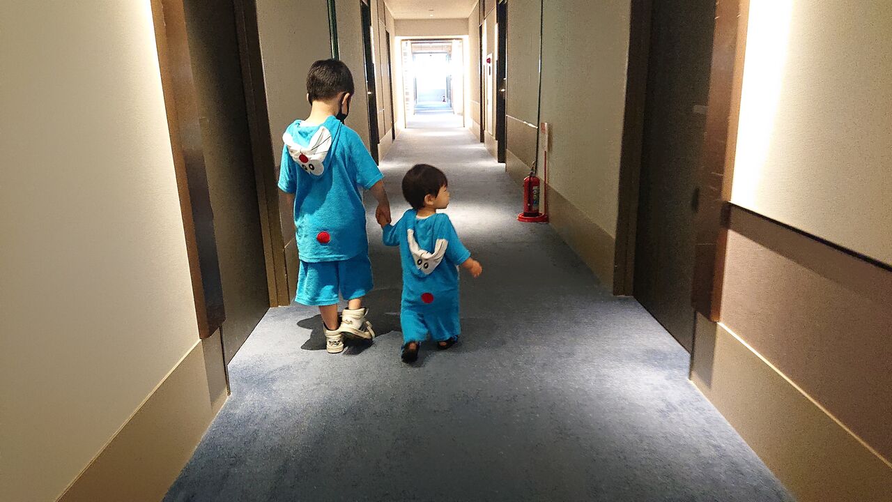 翌朝、いつも通り無駄に早く起きた息子①に起こされ、朝風呂に入った後、朝飯の時間となりました。何故かドラえもんの着ぐるみを寝間着として持ってきた嫁さんですが、朝飯にもドラえもんの格好のまま行かせるようです。可愛いけど、ちょっと恥ずかしいですよね。
