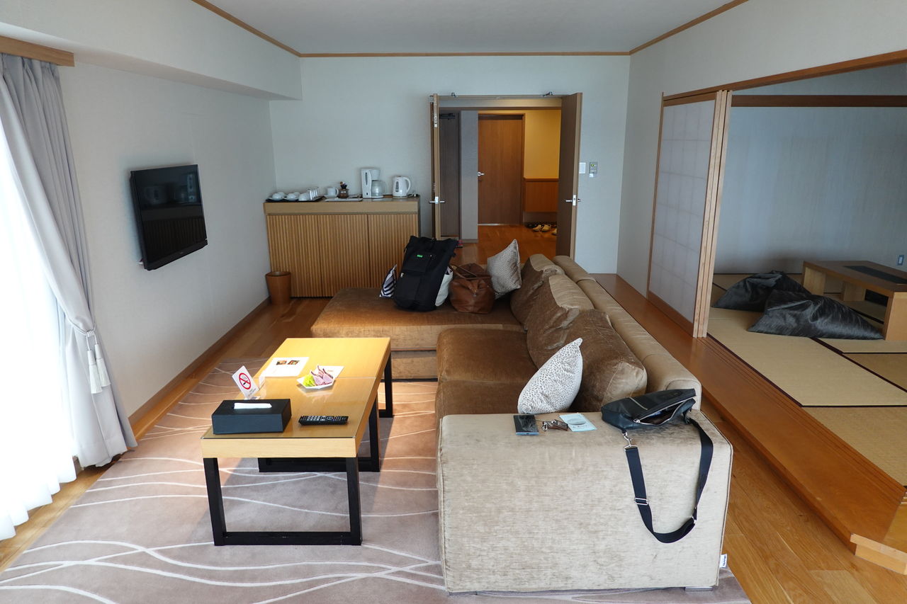 車を預けフロントに行くと、宿泊する部屋はスパリゾート館の「830」と「831」の2部屋だという事がわかりました。ホテルを予約して貰う際、(混雑していると思うから)泊まれればどこでも良いと伝えたのでこの時点では「上階だ! ラッキ-!!」くらいに思っていました。しかし、案内された我々が泊まる「831」は絶対に普通だと泊まることが出来ない特別室仕様で、慌ててなにかの間違いでは?と聞いたくらい豪華な部屋でした。