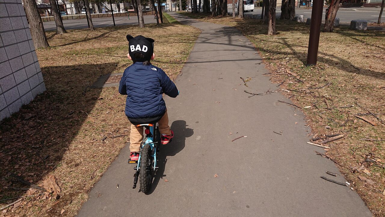 昨年のうちに自転車に乗れるようになったとは言え、約半年間のブランクがあるので最初は慎重にと思いましたが、そんな思いとは裏腹に息子①はスイスイっと自転車を漕ぎ始めます。本人曰く、自転車に乗れる自信は強く持っていたとのことで、実際運転している姿を見ても全く危なげがありません。むしろ体格や力が自転車のフレームに対して勝っている事から、かなり余裕を持って乗ることができるようです。